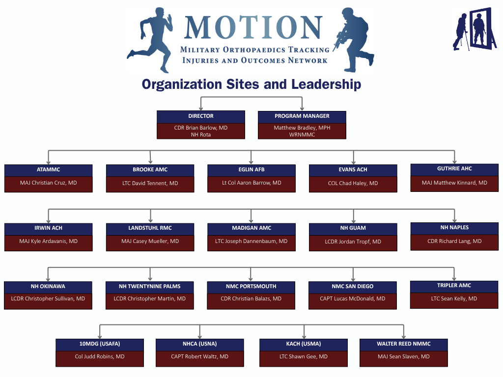 Musculoskeletal injuries (MSKI) remain the largest source of disability, readiness impairment, non-deployable status, and separation within the United States (US) Military. The Department of War (DoW) pays $3.7 billion annually for MSKI care; while the Department of Veterans Affairs pays in excess of $5.5 billion annually for MSKI related compensations. The Military Orthopaedics Tracking Injuries and Outcomes Network (MOTION) is the first tri-service, multi-center DoW-wide initiative to optimize military-specific and clinically-relevant patient outcome metrics for MSKI.